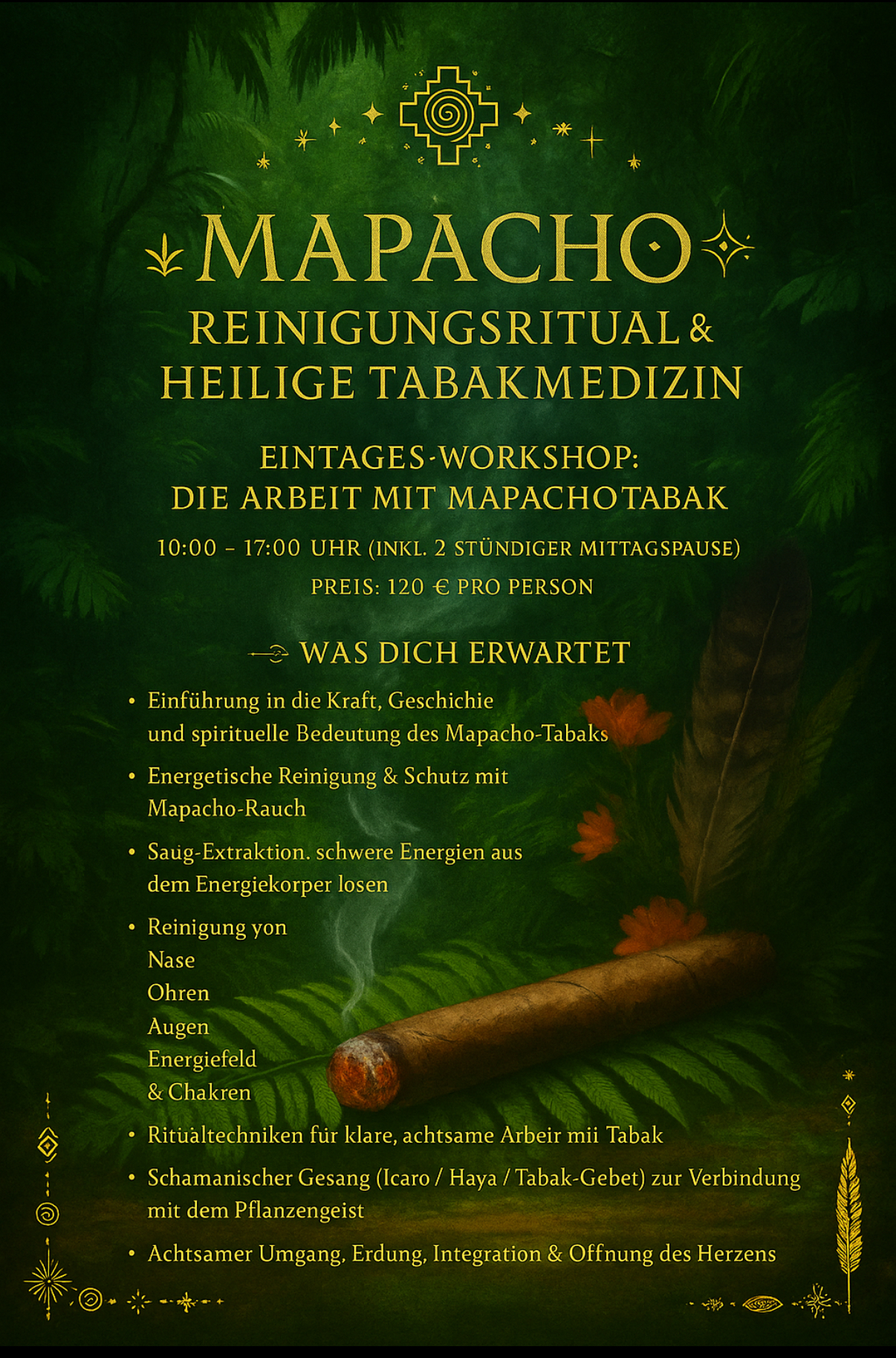 Dieser Tag dient der energetischen Reinigung, der tiefen Erdung, der Verbindung mit dem Pflanzengeist Tabak und der Aktivierung deiner eigenen Heilkraft. Du lernst, Mapacho bewusst und respektvoll zu nutzen – nicht als Rauchware, sondern als heilige Medizin und Werkzeug des Lichts.